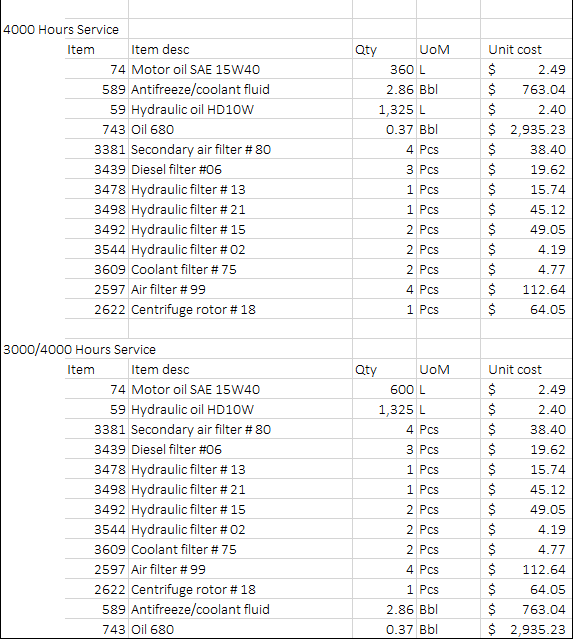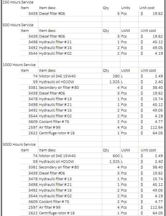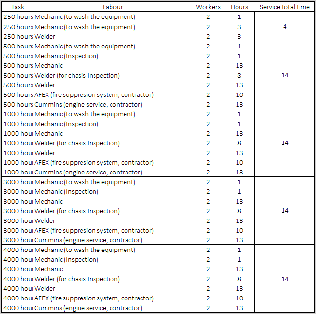 For most equipment, the manuals will require periodical services, they can be in KM or miles (like for your car) or in hours, in the case of industrial equipment. In this case, here are the intervals we will use, and how long the equipment must be out of work (including travelling time to the shop)