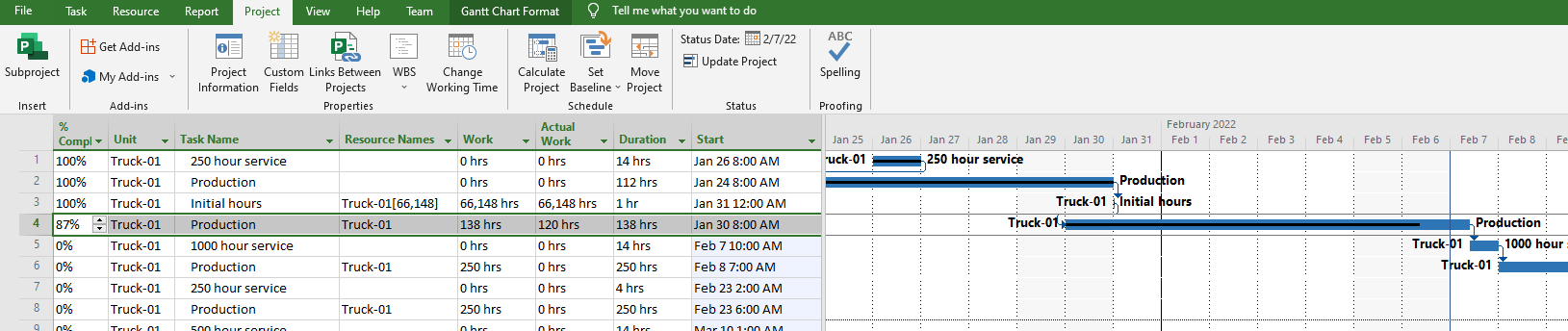The third activity will be the 66,148 initial hours, (don’t worry about the start dates just yet), at 100% completed. Resource is Truck-01[66,148].