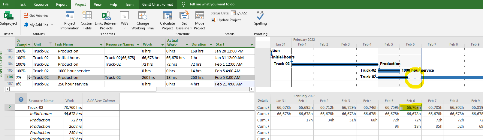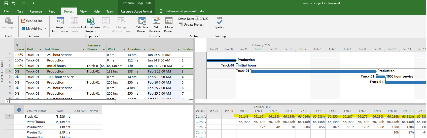 Specify “Cum. Work” under Details and Press on any “Production” task, and you will now see all the projected truck hours every day for the next two years, starting with Feb 1st hours (66,148 initial hours + 17-hour production the first day = 66,165).
