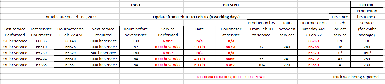 Notice that we are not particularly concerned about the past production tasks, when they started, or when they finished, they are only there to tabulate the truck hours. In future reports, what we’ll want to see are the service dates and hour meter readings, those will be accurate.