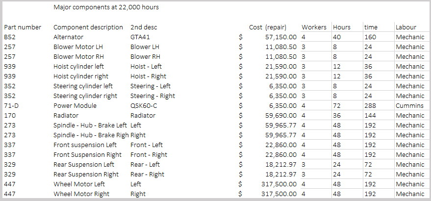 - A major overhaul is required at 22,000 hours (large component changes like wheel motors, hydraulic cylinders, suspension, radiator, etc.)